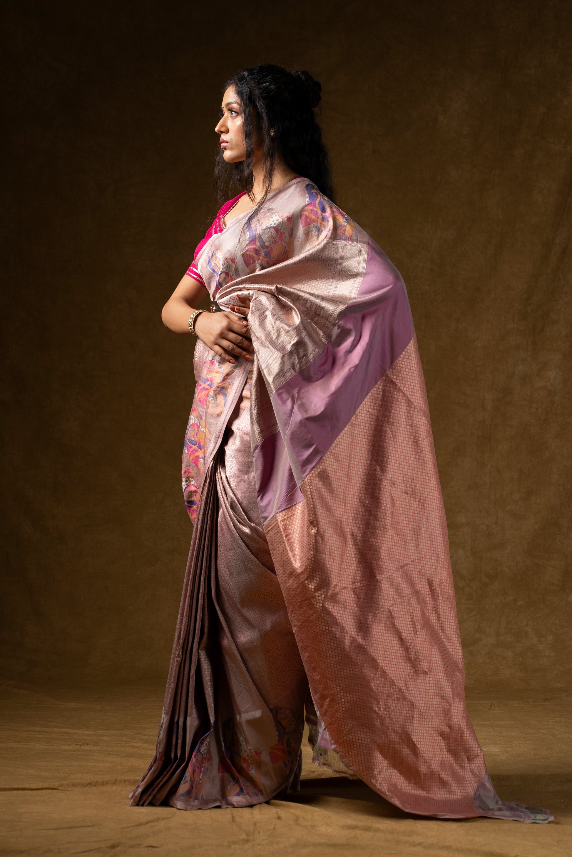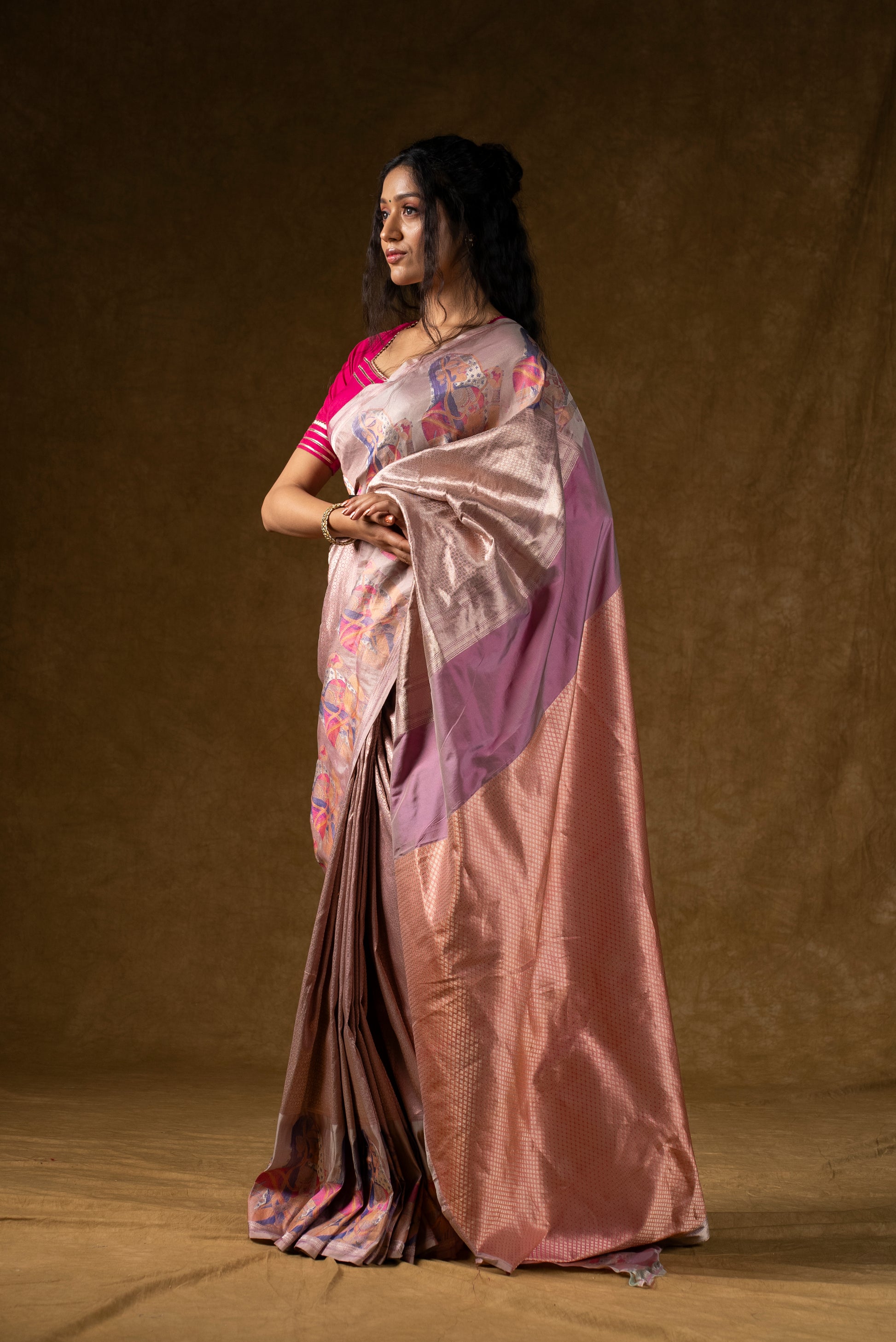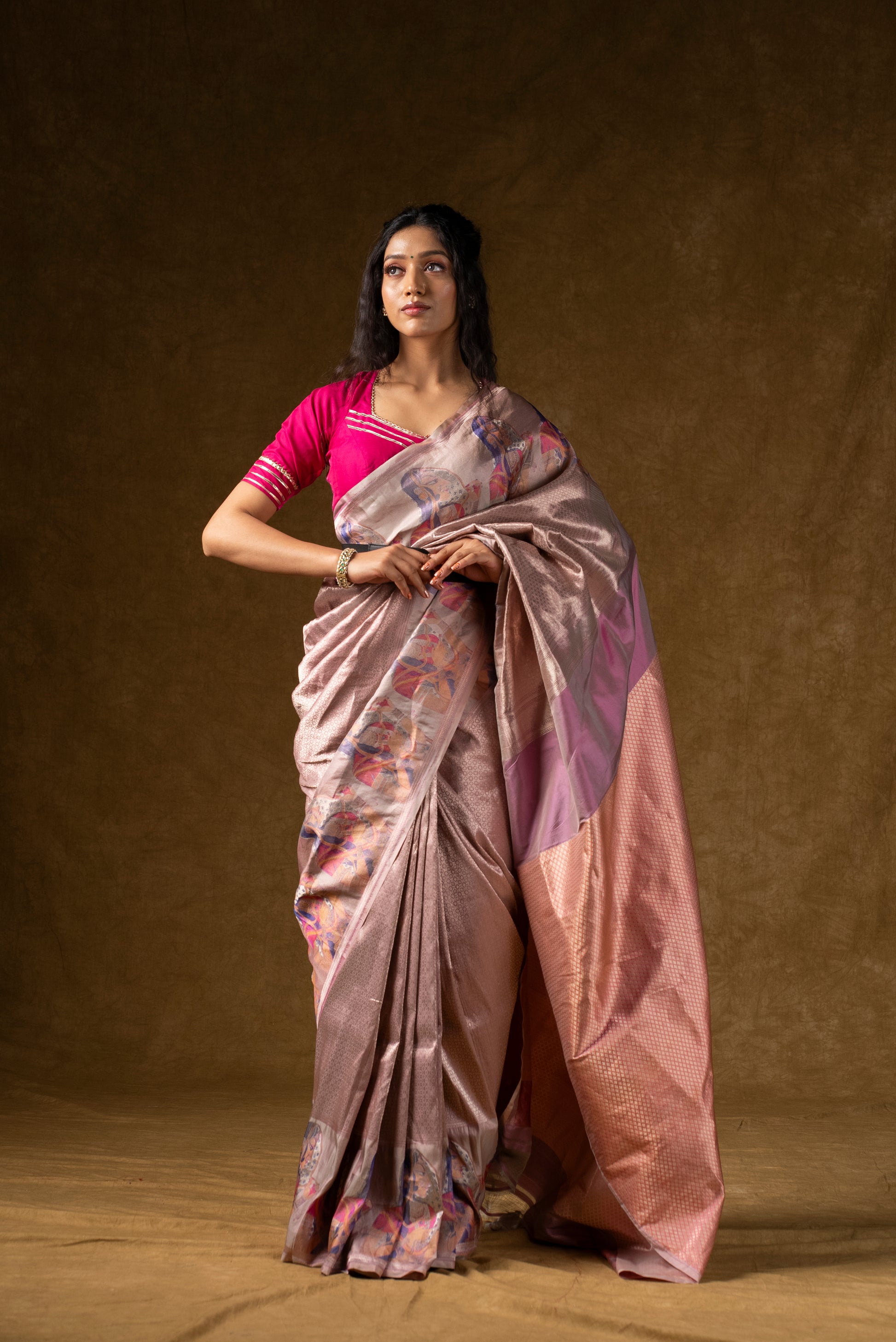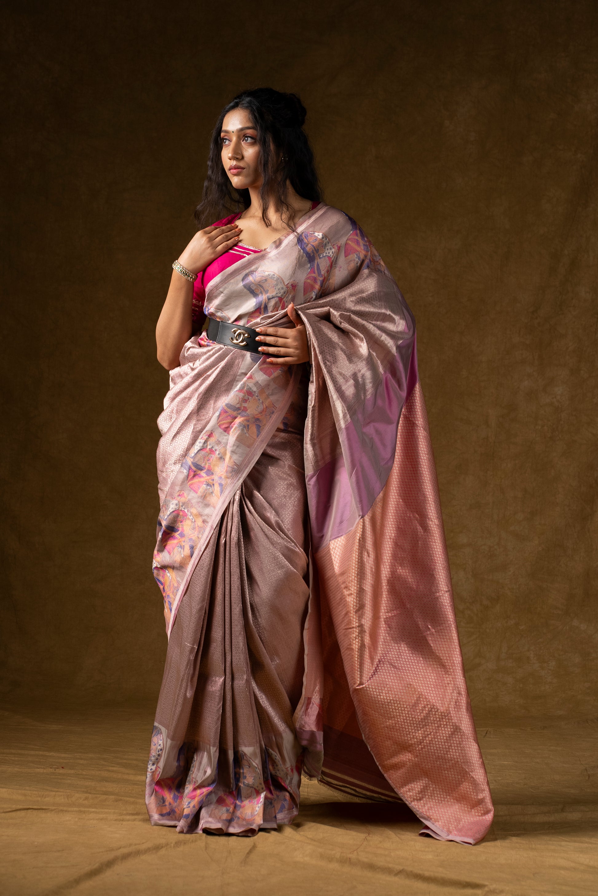 A sophisticated rose-gold silk saree featuring subtle abstract floral motifs for a contemporary twist on tradition.