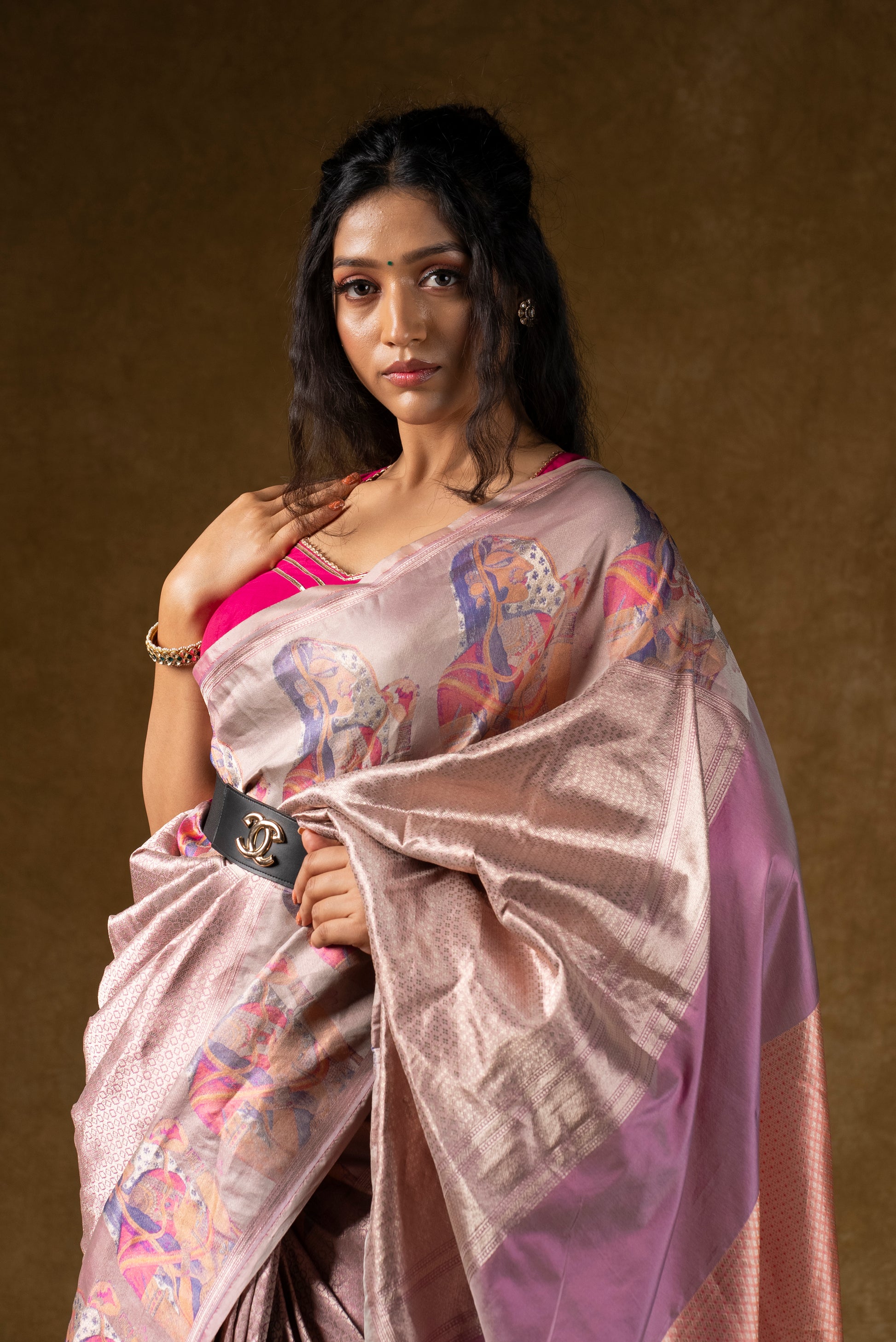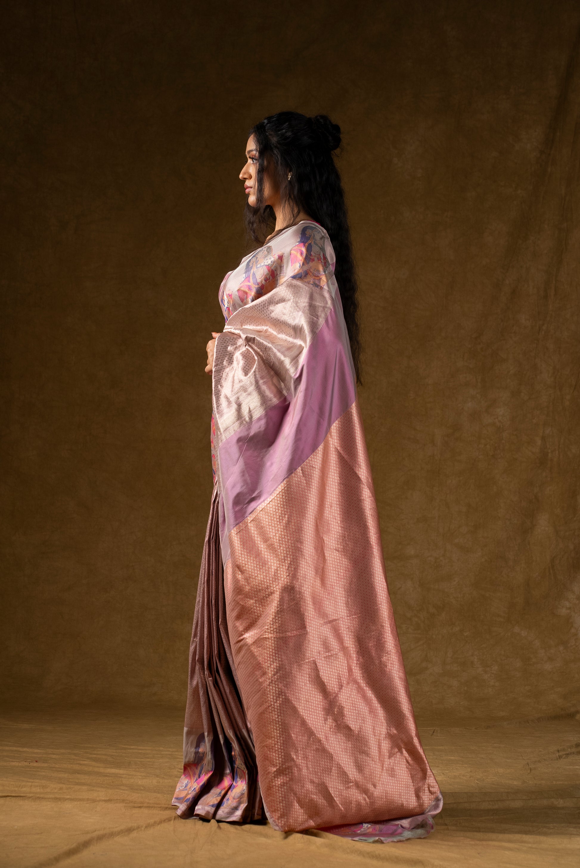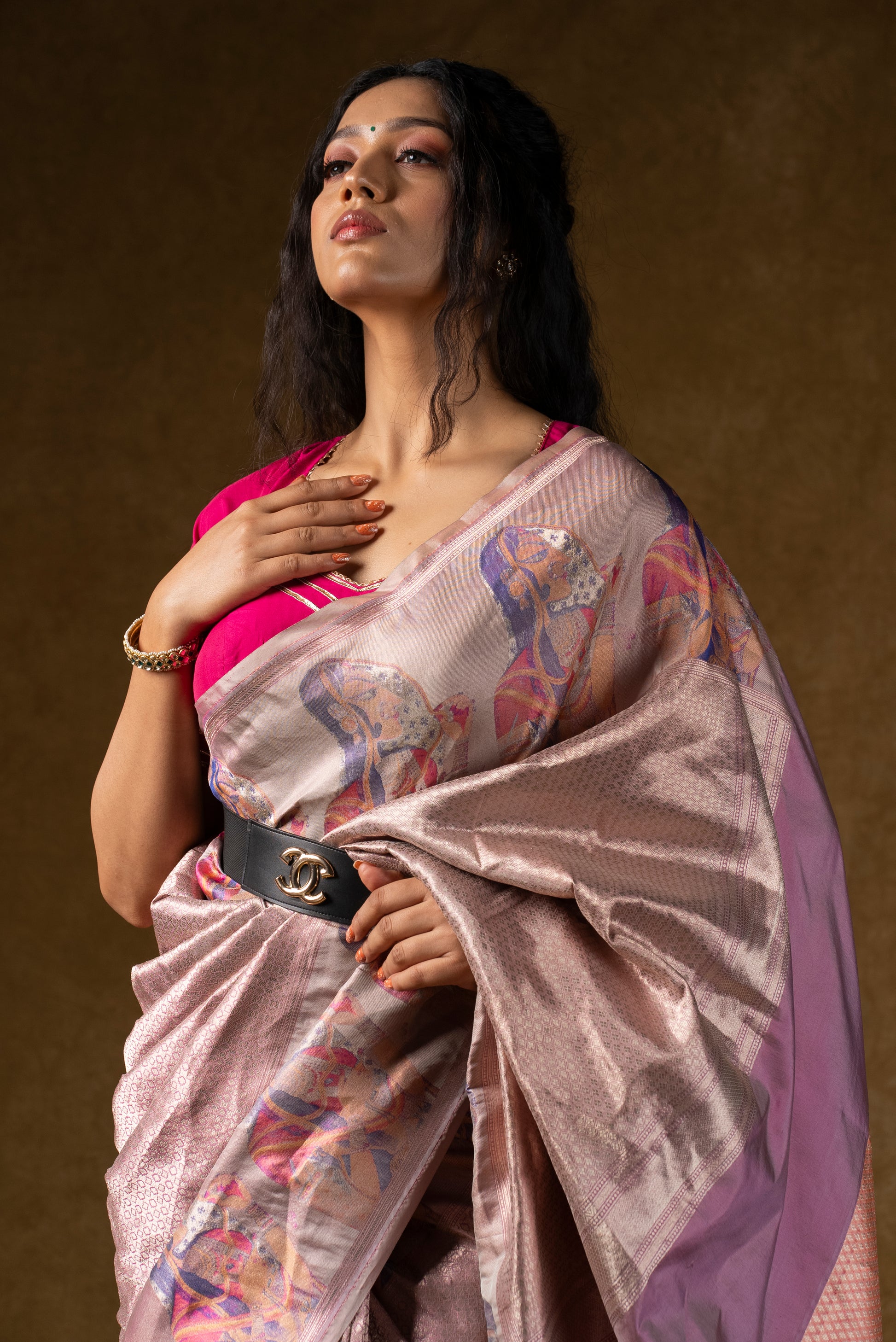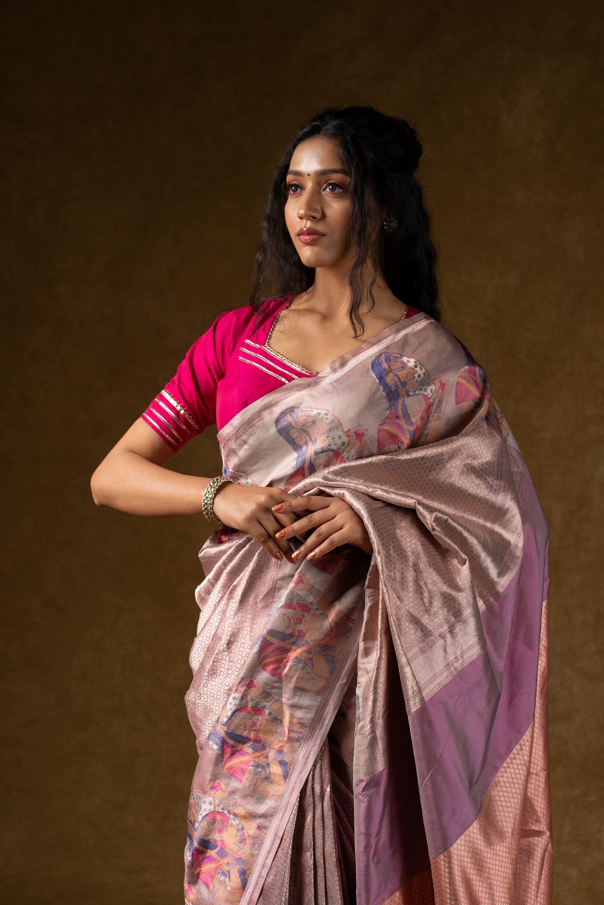 A sophisticated rose-gold silk saree featuring subtle abstract floral motifs for a contemporary twist on tradition.