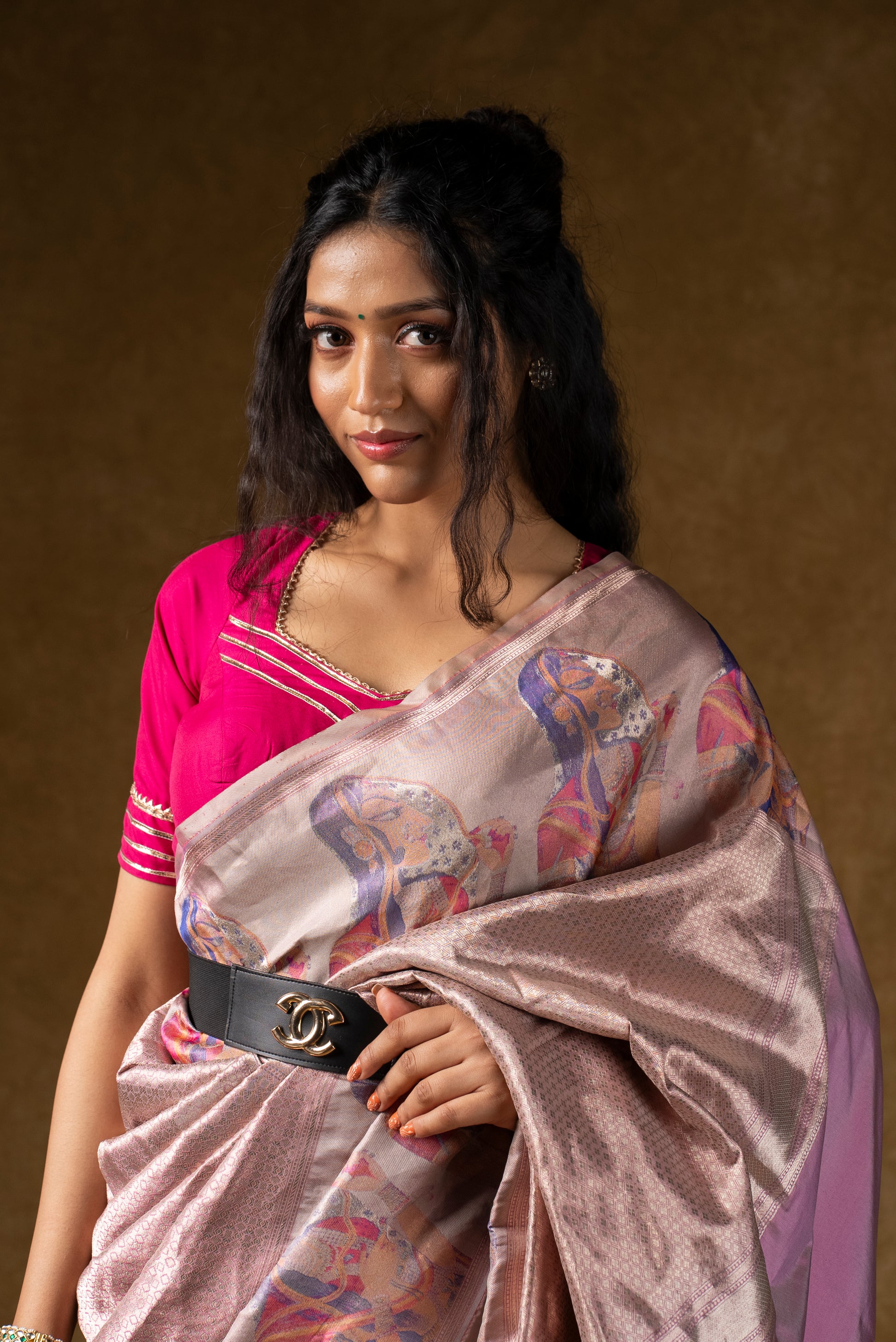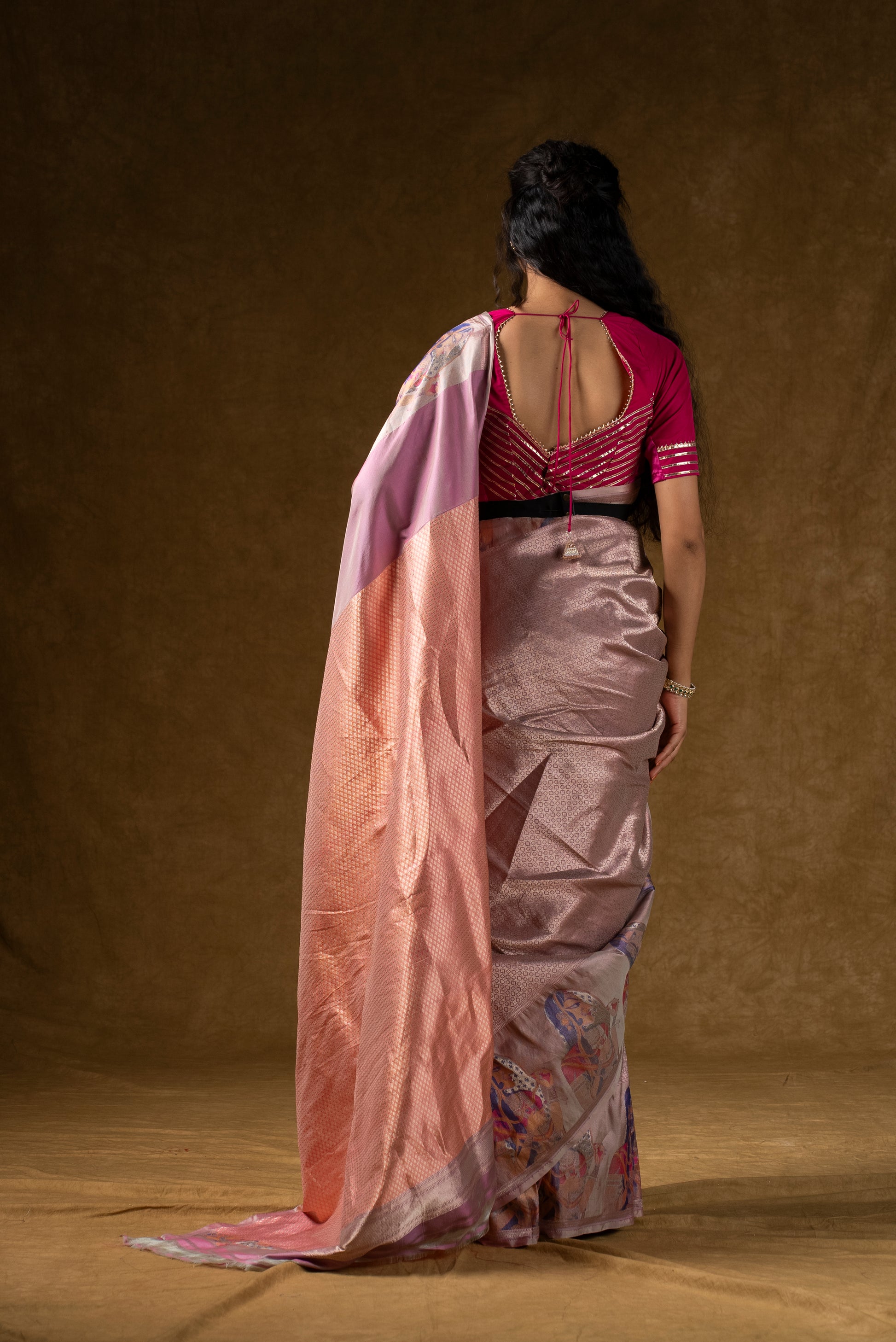 This saree combines modern aesthetics with traditional charm through its rose-gold base adorned with abstract floral designs. The soft silk blend fabric ensures a graceful drape, making it perfect for both formal events and festive occasions. The minimal yet elegant design makes it versatile for styling.
