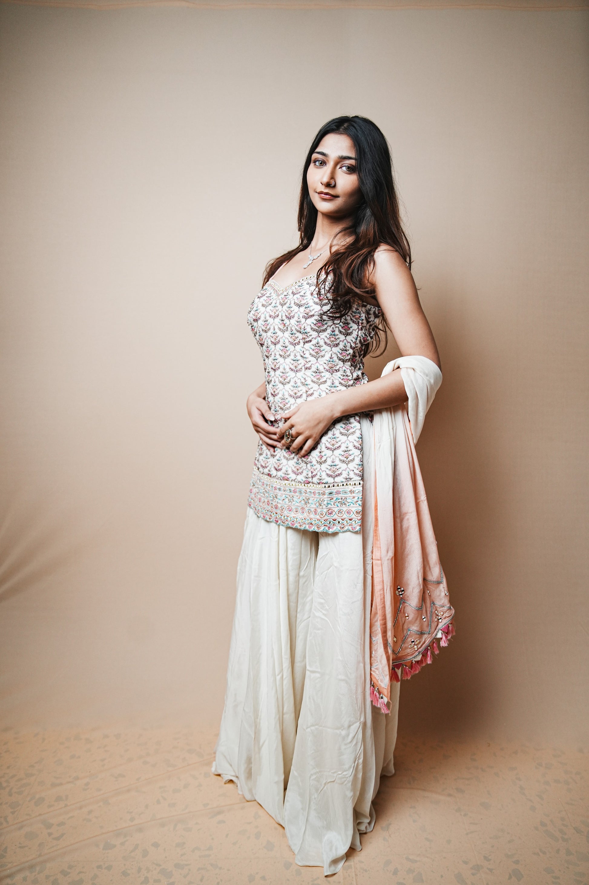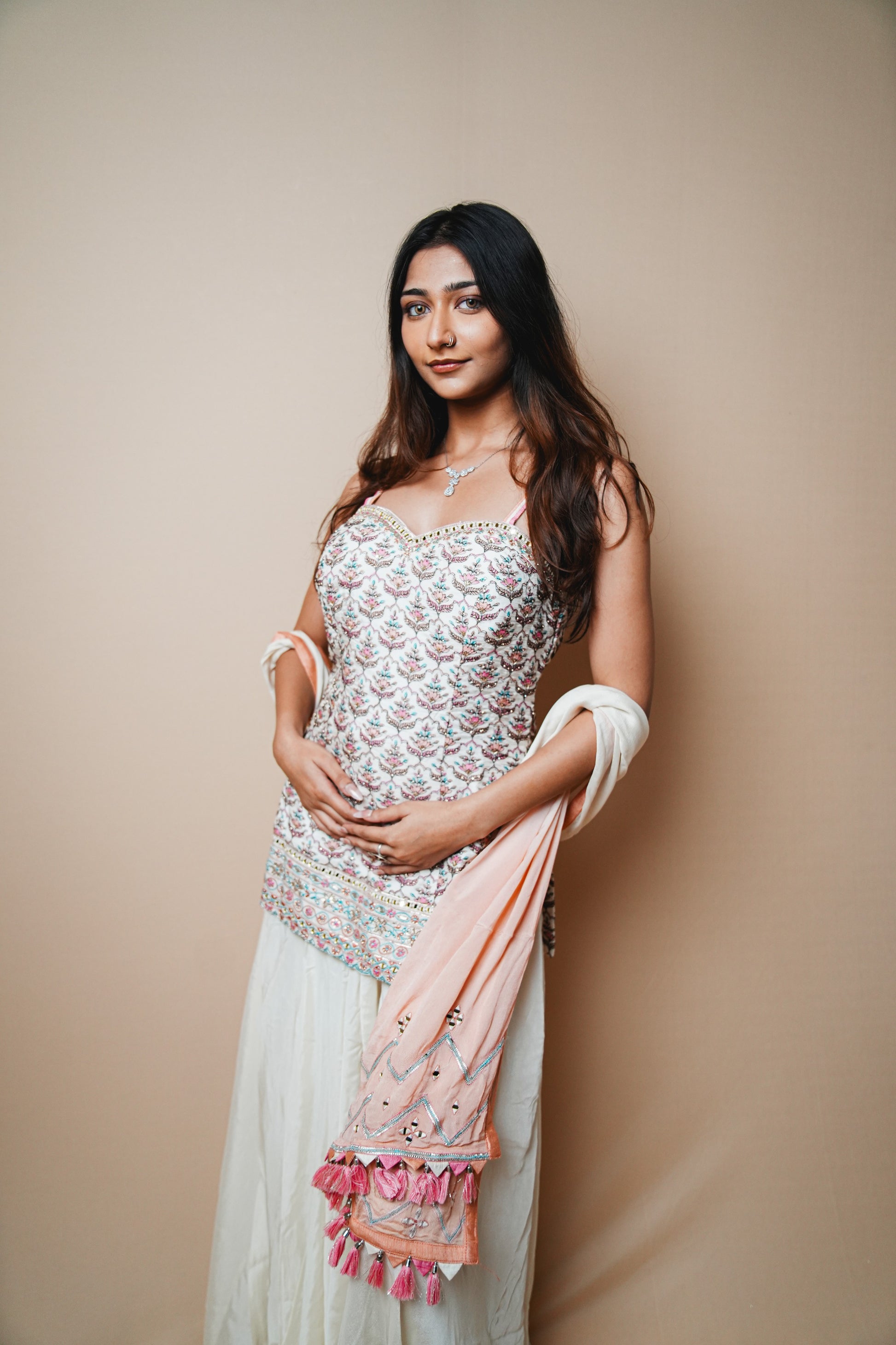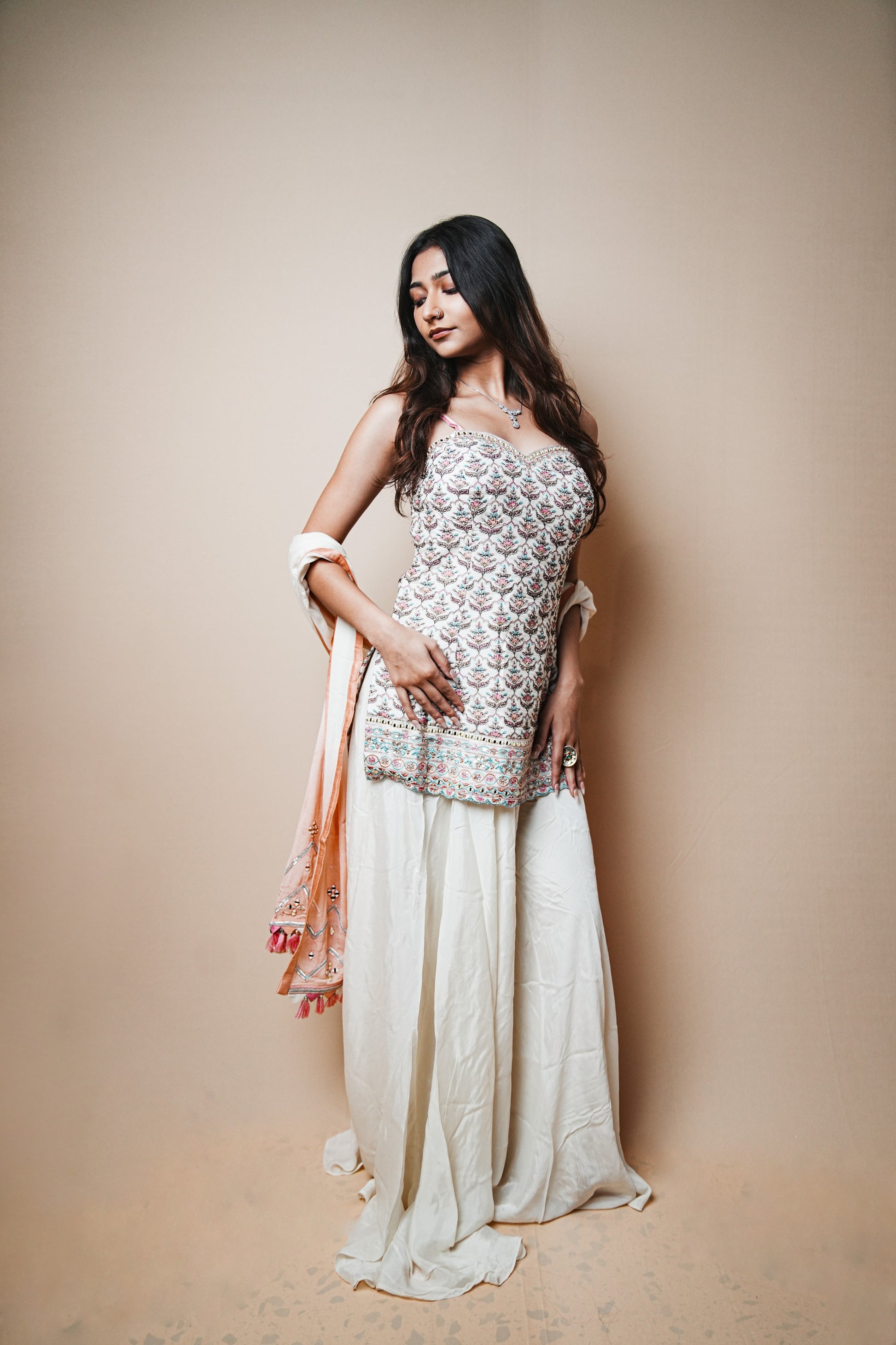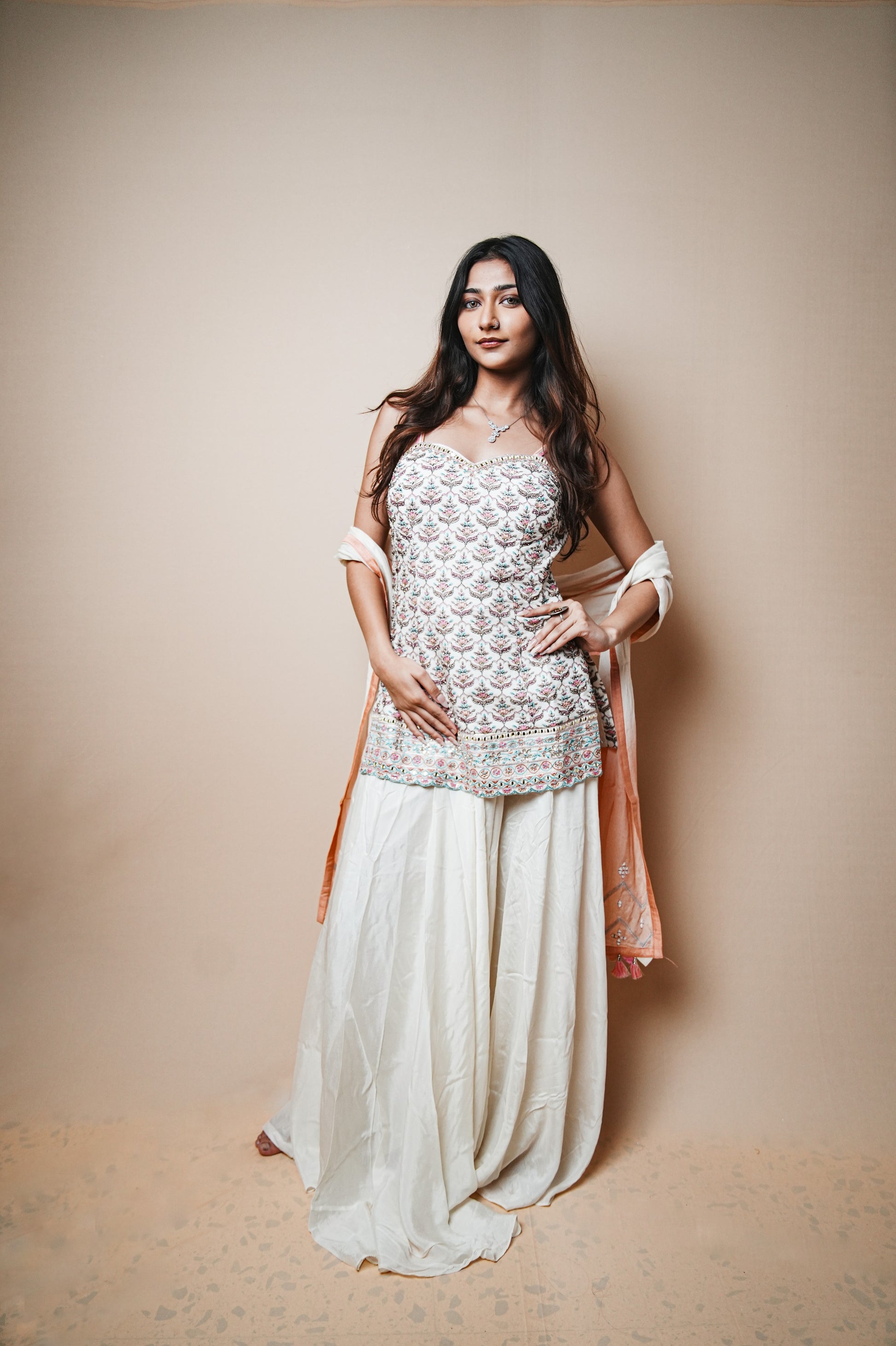 Grace meets elegance in this beautifully crafted crab silk plazo set, featuring a delicate and intricately designed spaghetti blouse adorned with detailed Resham (thread) embroidery. The pastel color palette, combined with soft, flowing fabric, gives this outfit a refined and graceful appearance. A contrasting peach dupatta with embroidered motifs and tassel edging completes the look, perfect for festive occasions and daytime celebrations.